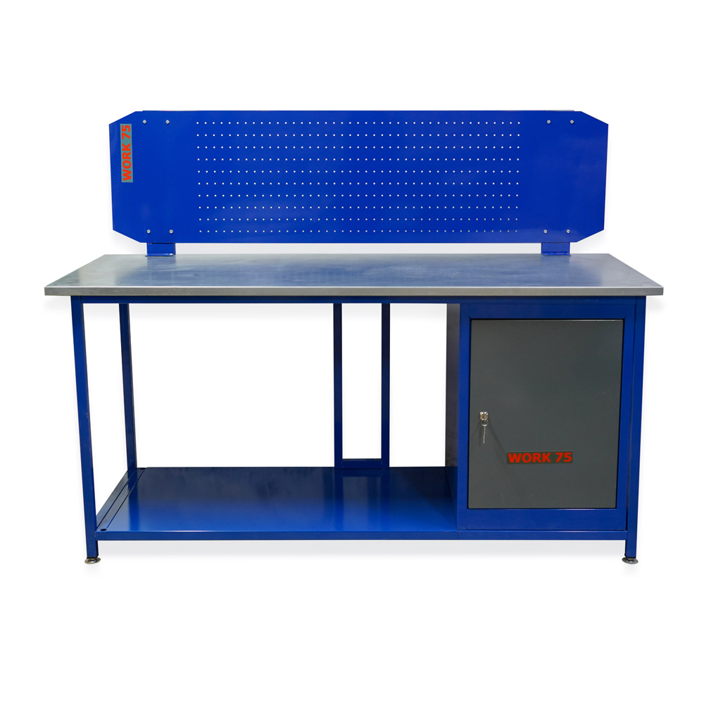 Рабочая поверхность рассчитана на реальную нагрузку. Внутри столешницы — фанера 24 мм, сверху — оцинкованный стальной лист 1,2 мм: такой “сэндвич” хорошо переносит повседневные удары, контакт с инструментом и мелкие загрязнения, а уборка после работы занимает минимум времени. Глубина столешницы 750 мм позволяет удобно разложить инструмент и заготовки, а максимальная распределенная нагрузка до 350 кг дает запас прочности для слесарных и сборочных задач.